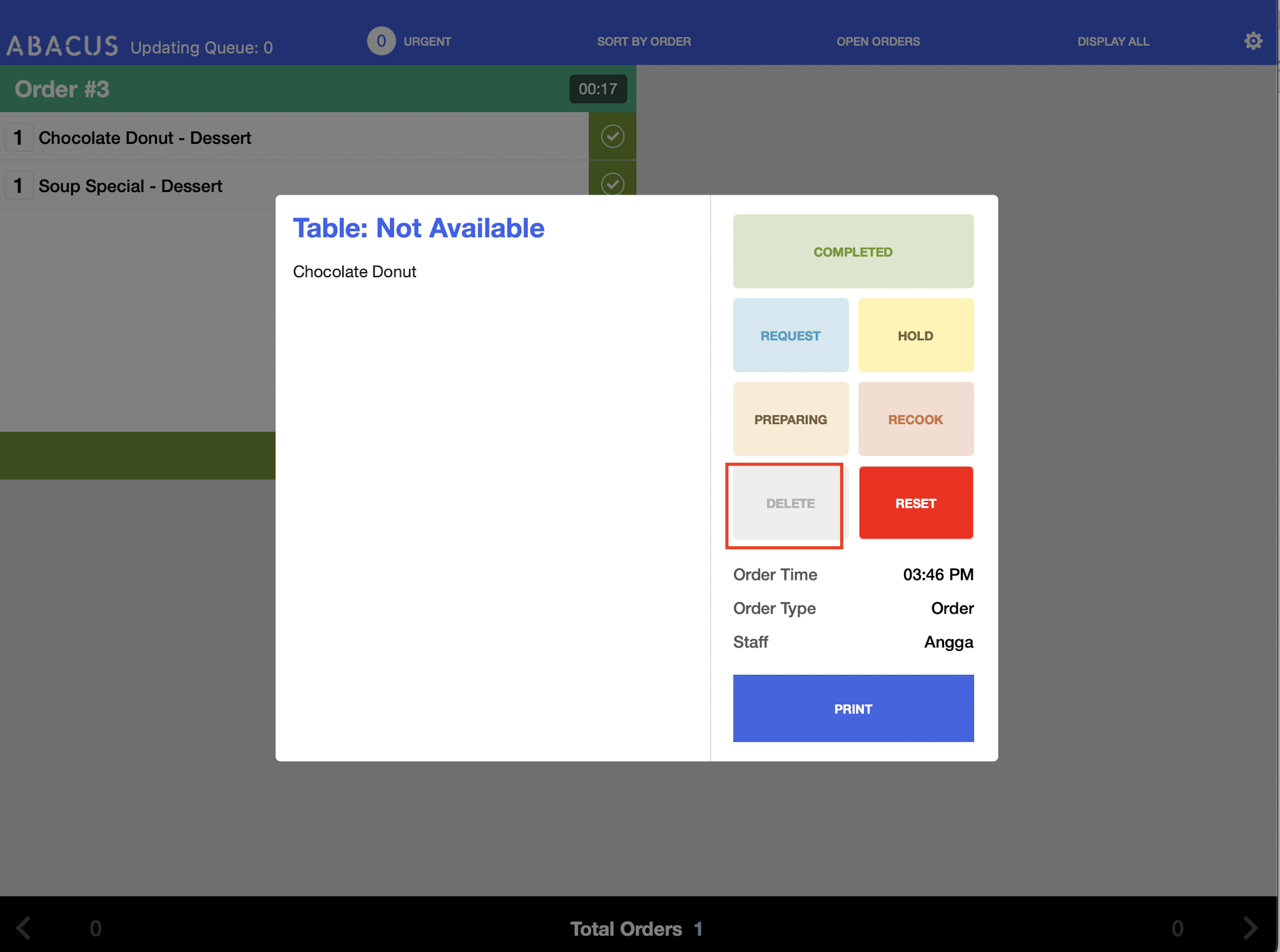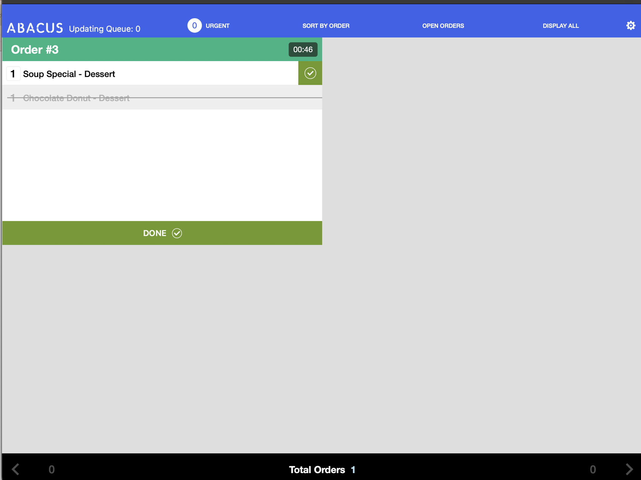 In Abacus POS, staff can delete individual items directly from the Kitchen Display System (KDS). This is useful if an item was entered incorrectly, a customer changes their order, or the kitchen needs to remove an item after the order has been sent from the POS. Deleting items from the KDS ensures that the change is reflected across the entire system, including the POS and the invoice, helping to keep orders and reporting accurate.