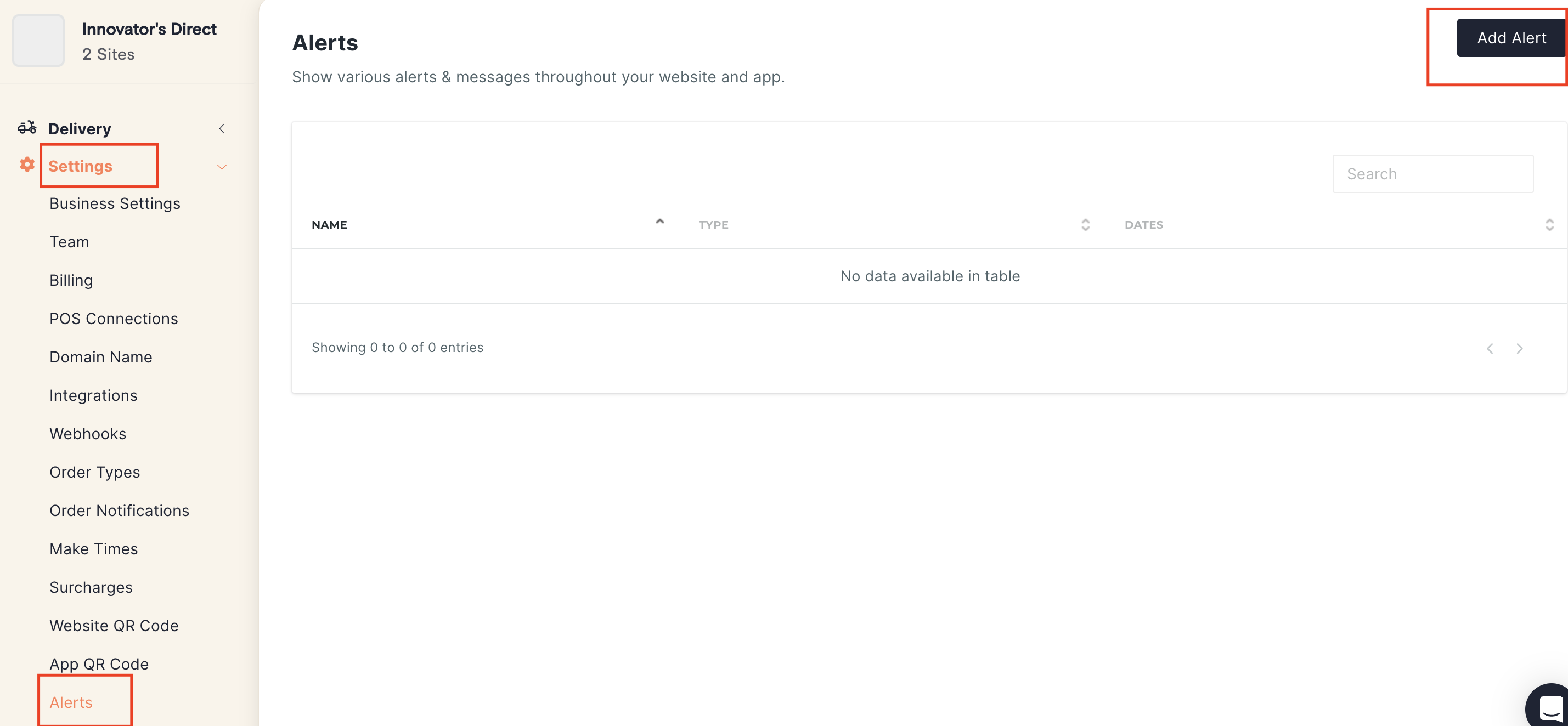 Click Save Alert. The alert will be displayed to customers when they visit your online ordering website or app.