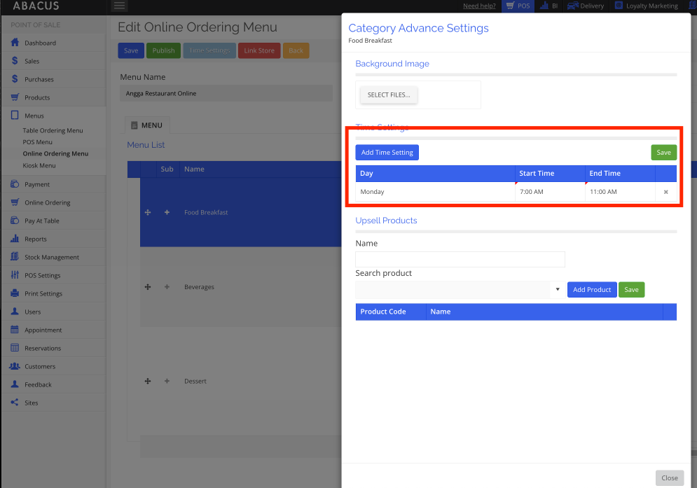 You can control when certain menu categories appear on your online ordering menu by setting display times. This is helpful for items that are only available during certain hours, such as lunch menus, happy hour drinks, or dinner-only items.
