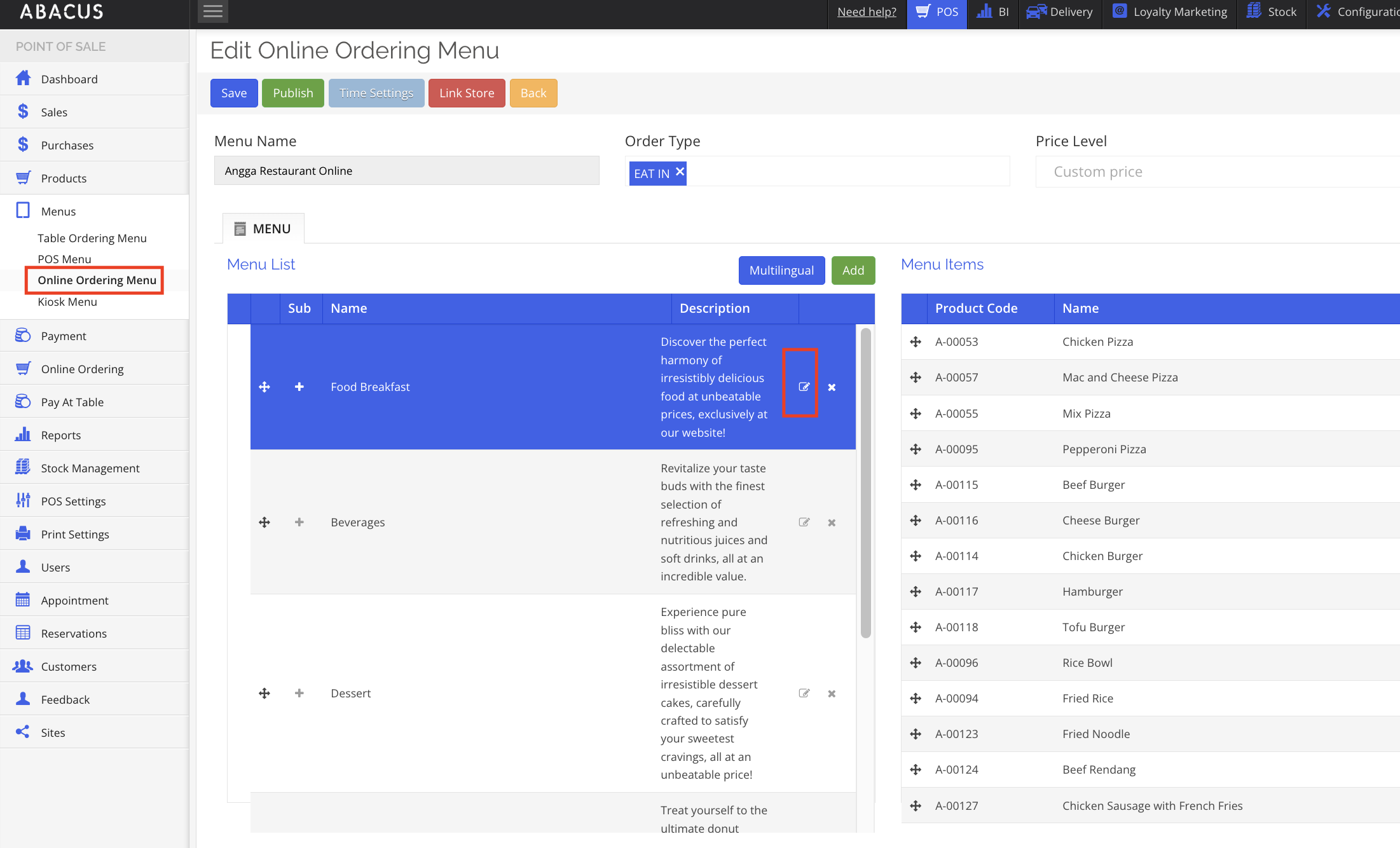 Go to Menus > Online Ordering Menus and open the menu you want to update.